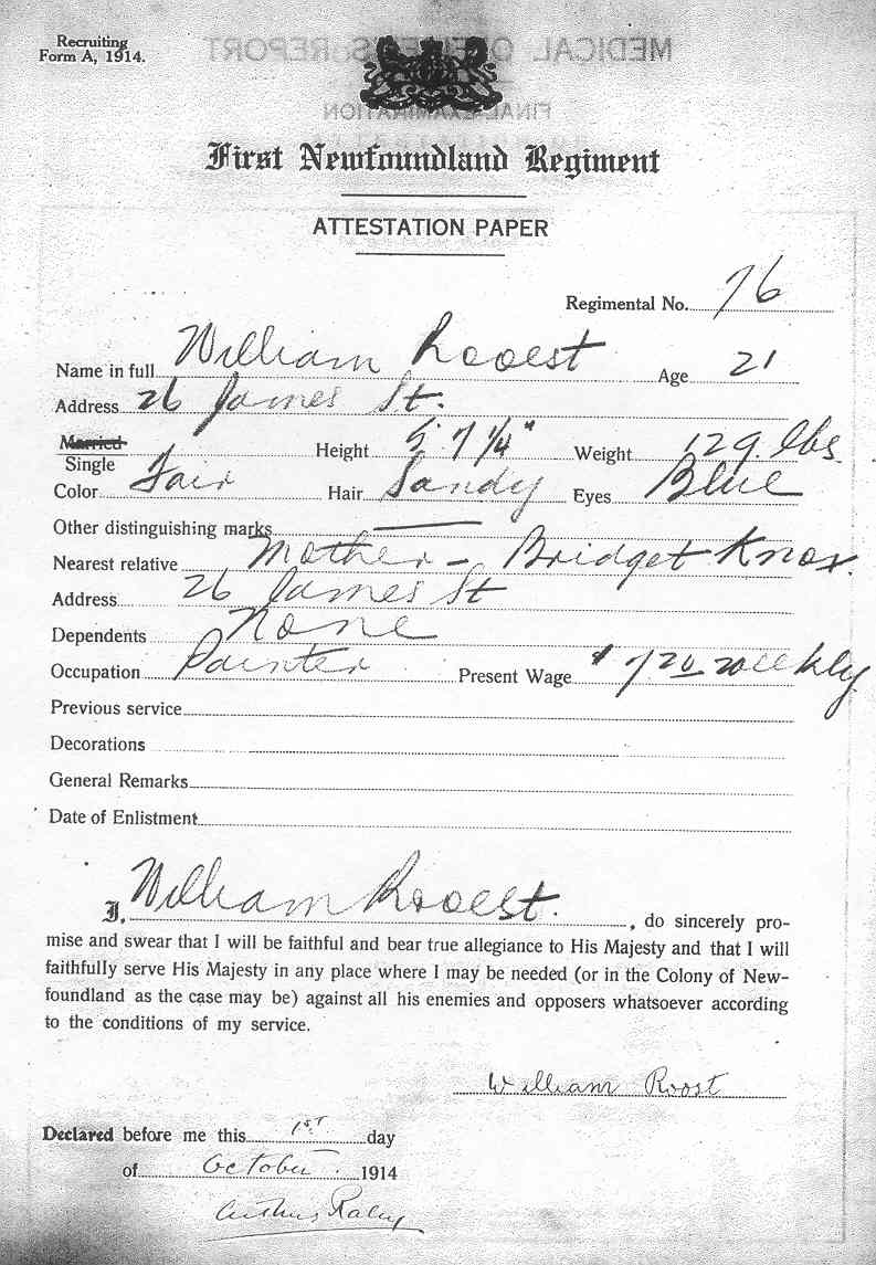 First Newfoundland Regiment Attestation Paper Regimental No. 76 Name in full: William Roost