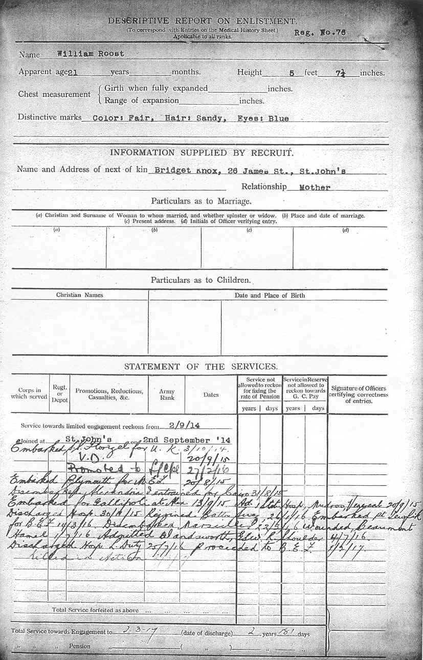 Reg. No. 76 Name: William Roost Information Supplied by Recruit Name and Address of next of kin, Bridget Knox, 26 James St., St. John's Relationship: Mother