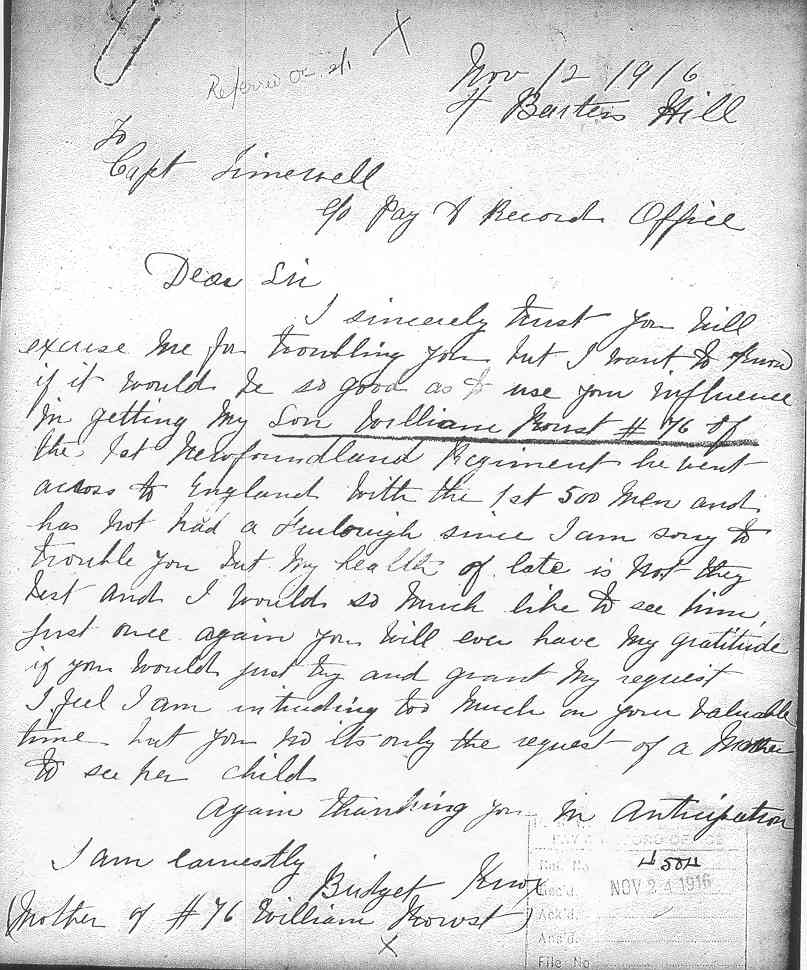 Nov 12 1916 To Capt Timewell c/o Pay & Record Office Dear Sir, I sincerely trust you will excuse me for troubling you but I want to know if it would be so good as I use your influence in getting my son William Roost # 76 of the 1st Newfoundland Regiment be sent across to England with the 1st 500 man and has not had a furlough since I am sorry to trouble you but my health of late is not the best and I would so much like to see him just once again you will ever have my gratitude if you would just try and grant my request. I feel I am intruding too much on your valuable time but you no its only the request of a mother to see her child. Again thanking you in anticipation